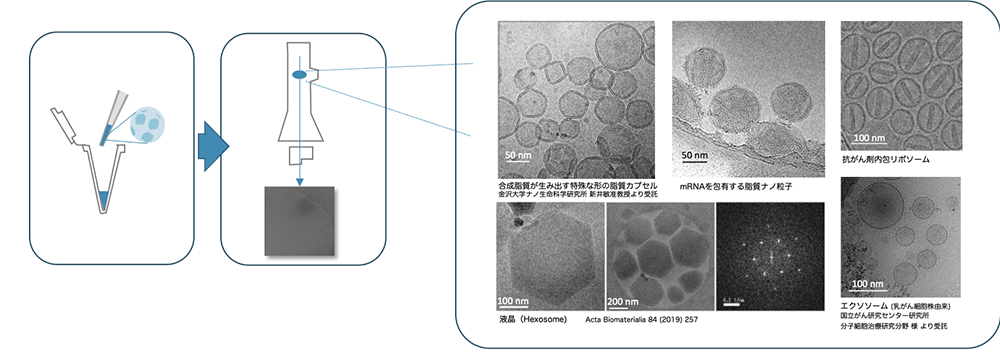 数10〜数100ナノメートルスケールの微粒子を、溶液のまま凍結、観察します。